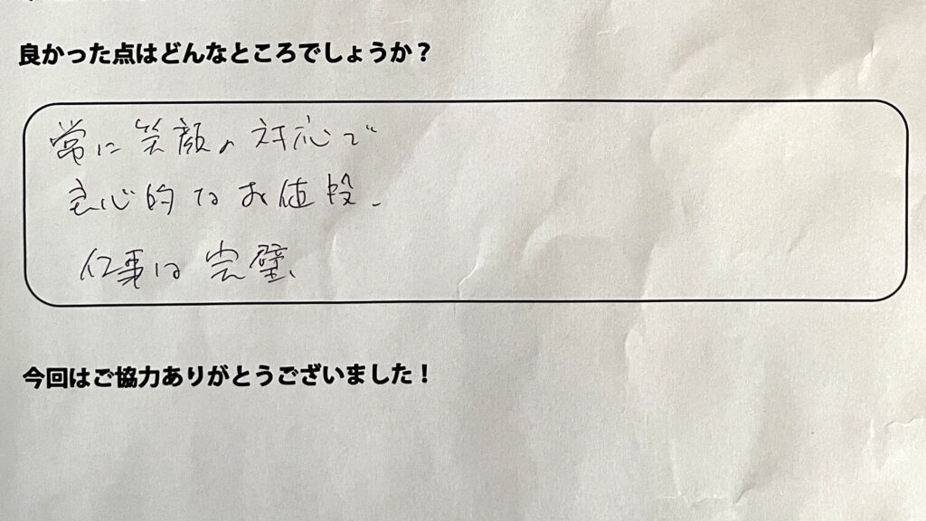 調査の際は少しお時間多くかかってしまいましたが、お気遣いを頂きこちらこそありがとうございました!