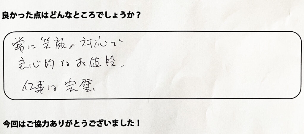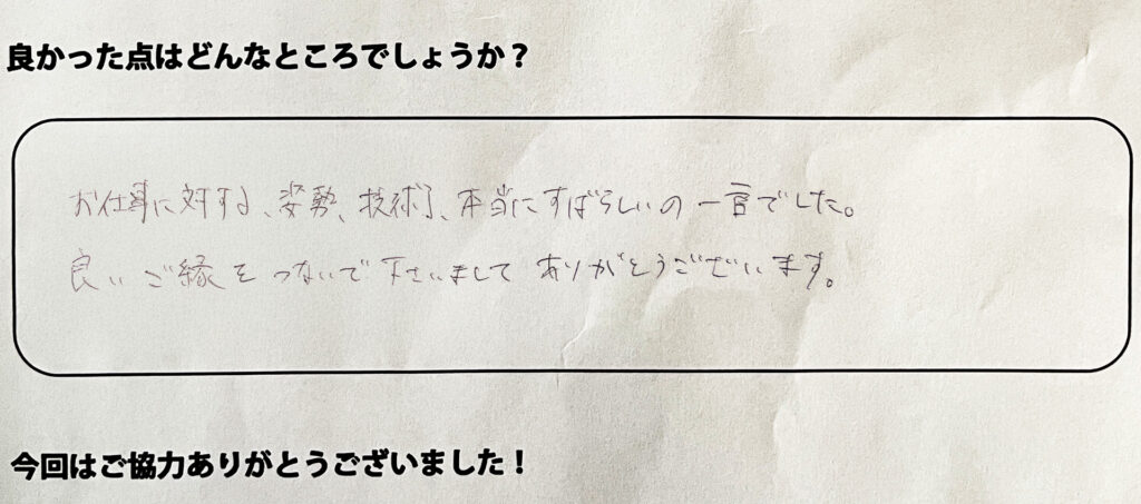 お褒め頂きありがとうございます!これからもお客様にご満足いただけるよう誠心誠意仕事に励んでまいります!