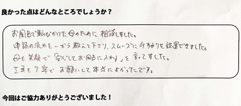 お風呂で転びかけた母のために相談しました。申請の流れを一から教えてくださり、スムーズに手すりを設置できました。母も笑顔で「安心してお風呂に入れる」と言っていました。工事も丁寧で、お願いしてよかったです。