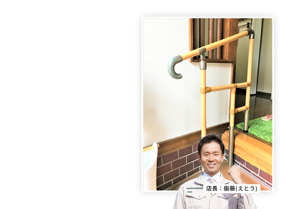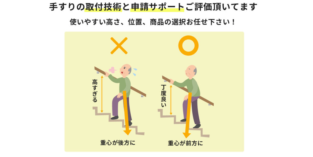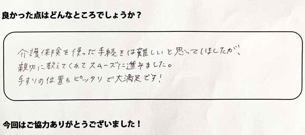 介護保険を使った手続きは難しいと思っていましたが、親切に教えてくれてスムーズに進みました。手すりの位置もピッタリで大満足です!