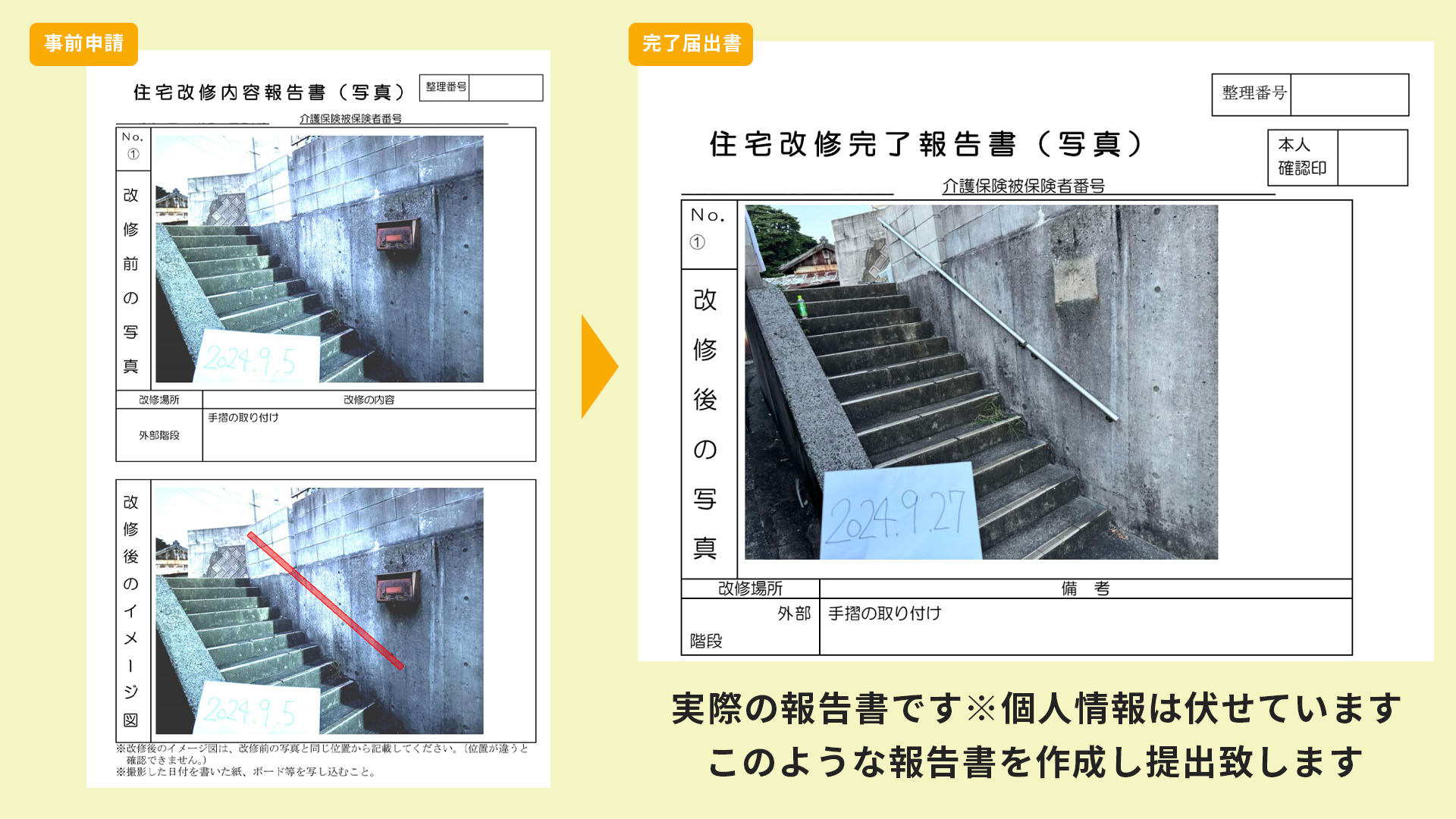 住宅改修の工事着工をします。工事完了後に届け出用の写真を撮ります。